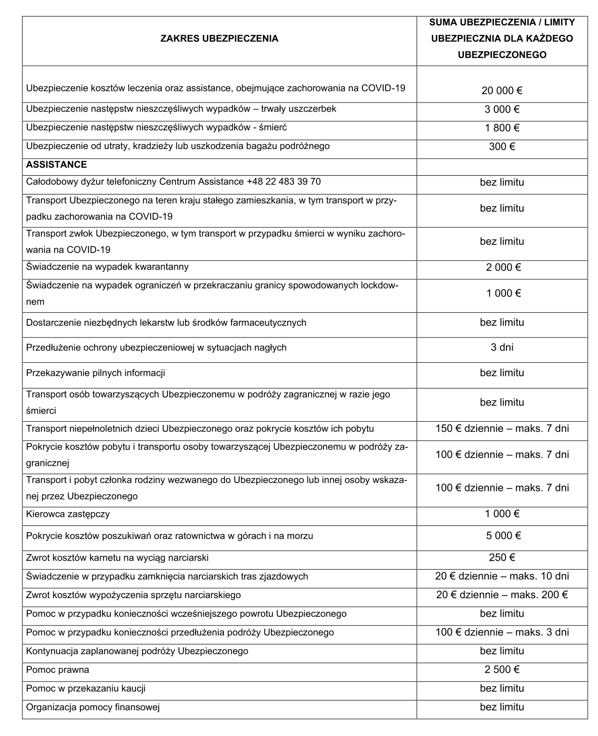 Wszędzie gdzie w powyższej tabeli suma ubezpieczenia określona jest jako „bez limitu”, oznacza to, iż Ubezpieczyciel pokrywa koszty do rzeczywistej kwoty, jaka odpowiada kosztom zorganizowania przez Centrum Assistance takiego transportu.
